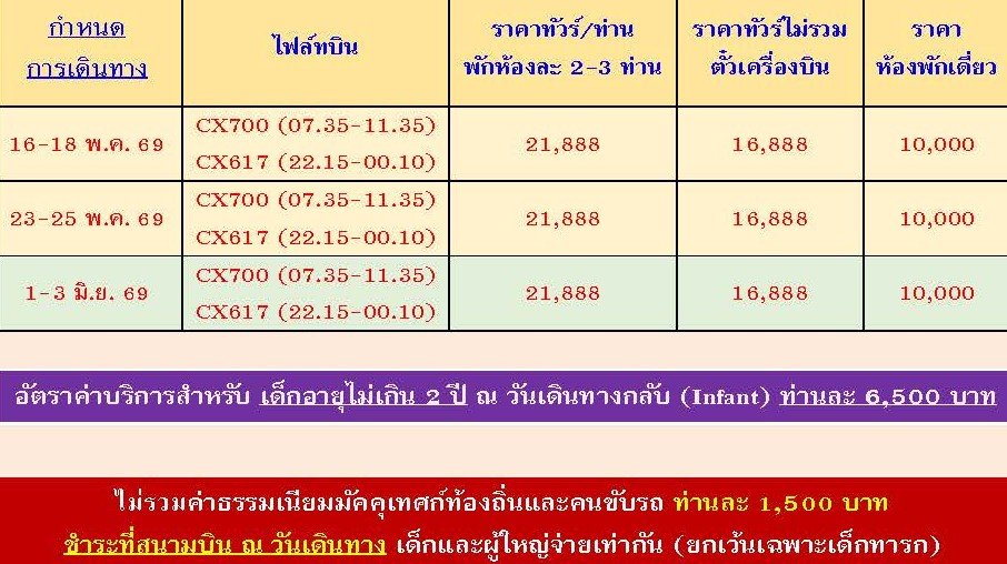 เดินทาง พ.ค. - มิ.ย. 69 | โดยสายการบิน CATHAY PACIFIC (CX) | • ฮ่องกง • อ่าวรีพัลส์เบย์ • เช็คอินอ่าววิคตอเรีย • ดิสนีย์แลนด์เต็มวัน • วัดเจ้าแม่ทับทิมทินหัว • วัดกวนไท • วัดเจ้าแม่กวนอิมฮองฮำ • วัดหวังต้าเซียน • ศูนย์รวมฮวงจุ้ยกังหันนำโชค • วัดแชกงหมิว