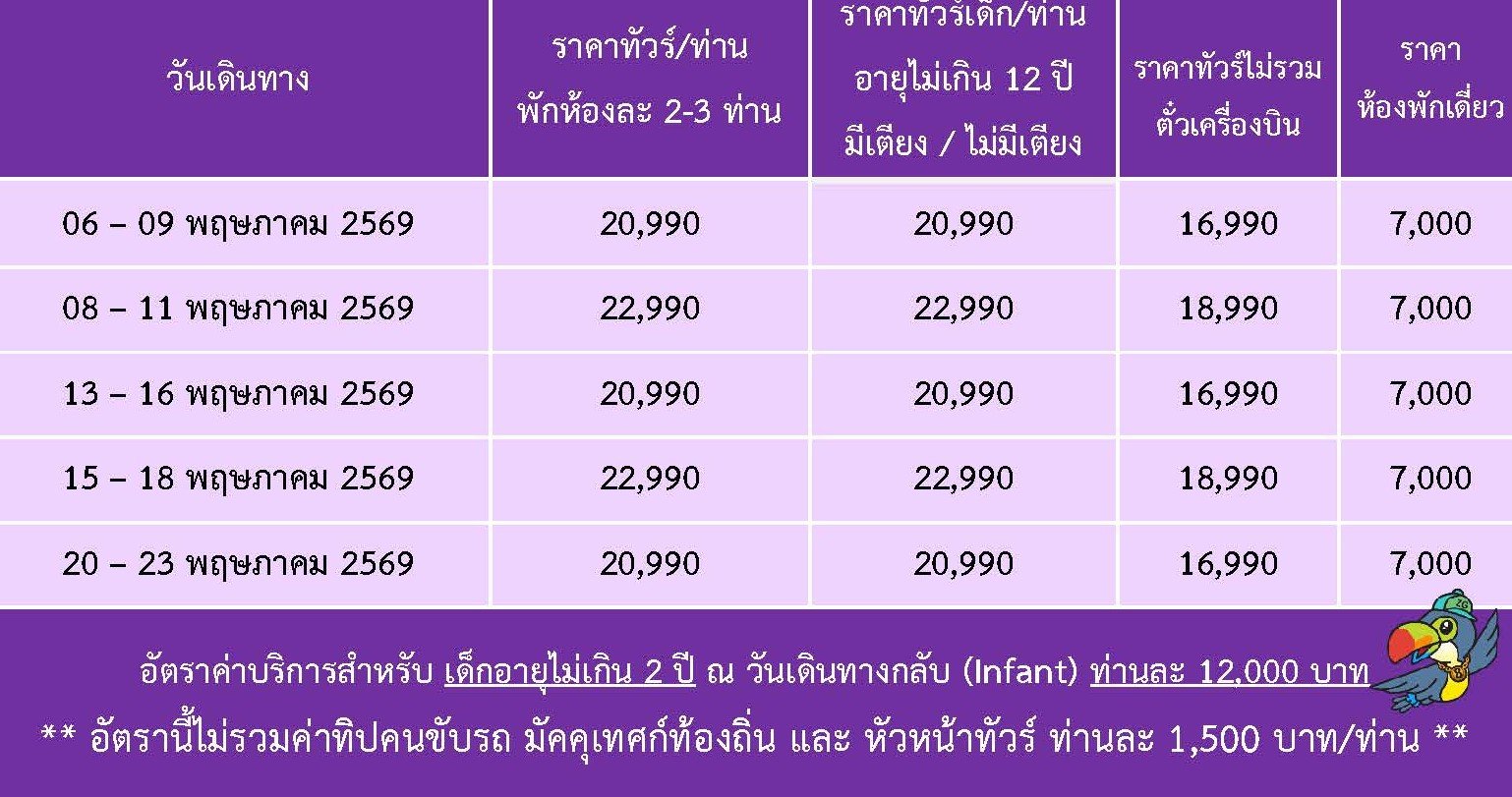 เดินทาง พ.ค. 69 | โดยสายการบิน HONGKONG AIRLINE (HX) | • นั่งกระเช้านองปิง • วัดโป่วหลิน นมัสการพระใหญ่เทียนถาน • หมู่บ้านวัฒนธรรมนองปิง • ห้างซิตี้เกต เอาท์เล็ท • รีพัลส์เบย์ • วิคตอเรียพีค • Avenue of Stars • ฮ่องกงดิสนีย์แลนด์เต็มวันชมการแสดงดอกไม้ไฟ • วัดแชกงหมิว • โรงงานจิวเวอร์รี่ • ร้านหยก • วัดหวังต้าเซียน • วัดเจ้าแม่กวนอิมฮ่องฮำ • วัดกวนไท • ช้อปปิ้งย่านจิมซาจุ่ย